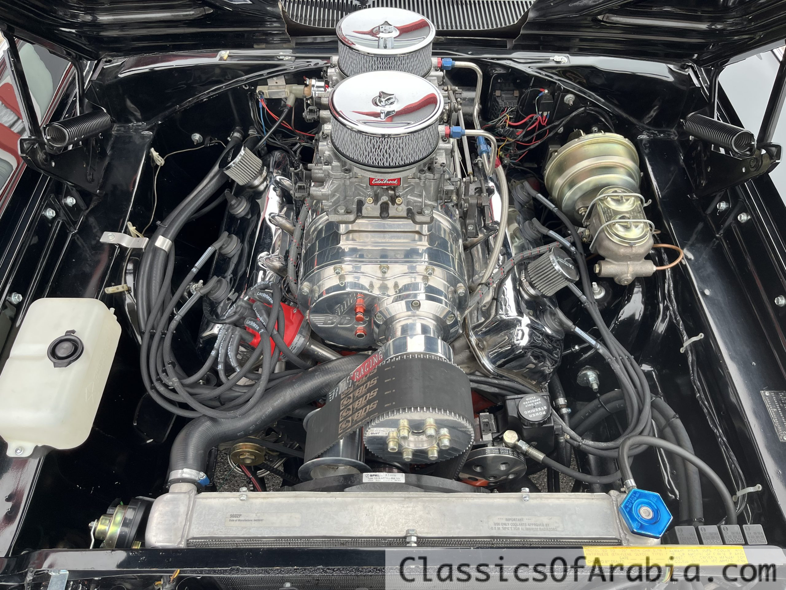 Features a 426 HEMI block cast by Chrysler for Keith Black Racing Engines in 1969. Stroked to 486 CID. Equipped with Indy aluminum dual-plug heads (16 spark plugs), Stage 1 BDS 8-71 supercharger. Raised exhaust ports. Edelbrock Thunder Series 650 CFM carburetors. Hooker Super Competition headers and X-pipe exhaust. Transmission is a 727 TorqueFlite automatic with a manual valve body from the 1960s, featuring. Reverse pattern shifting and a 4200 RPM stall converter. Shortened 8 3/4″ rear axle with limited-slip differential and 4.30 gear ratio.Reinforced Strange axles. HEMI torsion bars. Stock car eaf springs with adjustable shocks and CalTracs traction bars. Braking is handled by disc brakes and the car comes with power steering and power brakes.