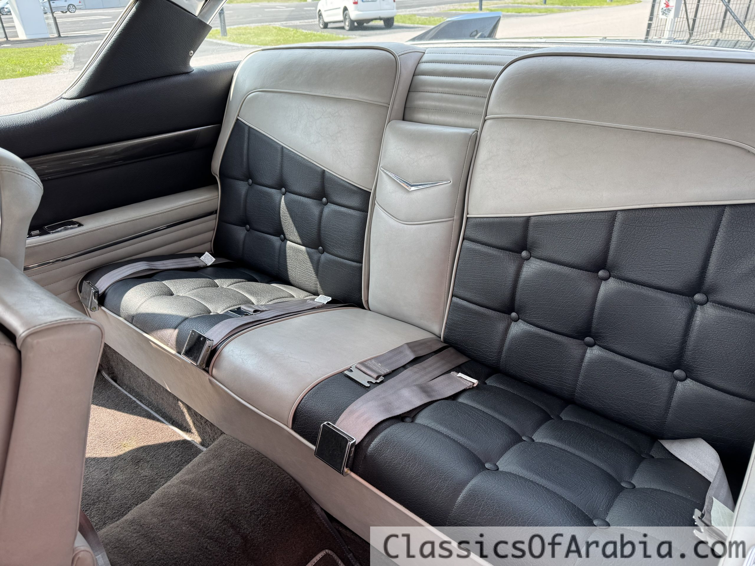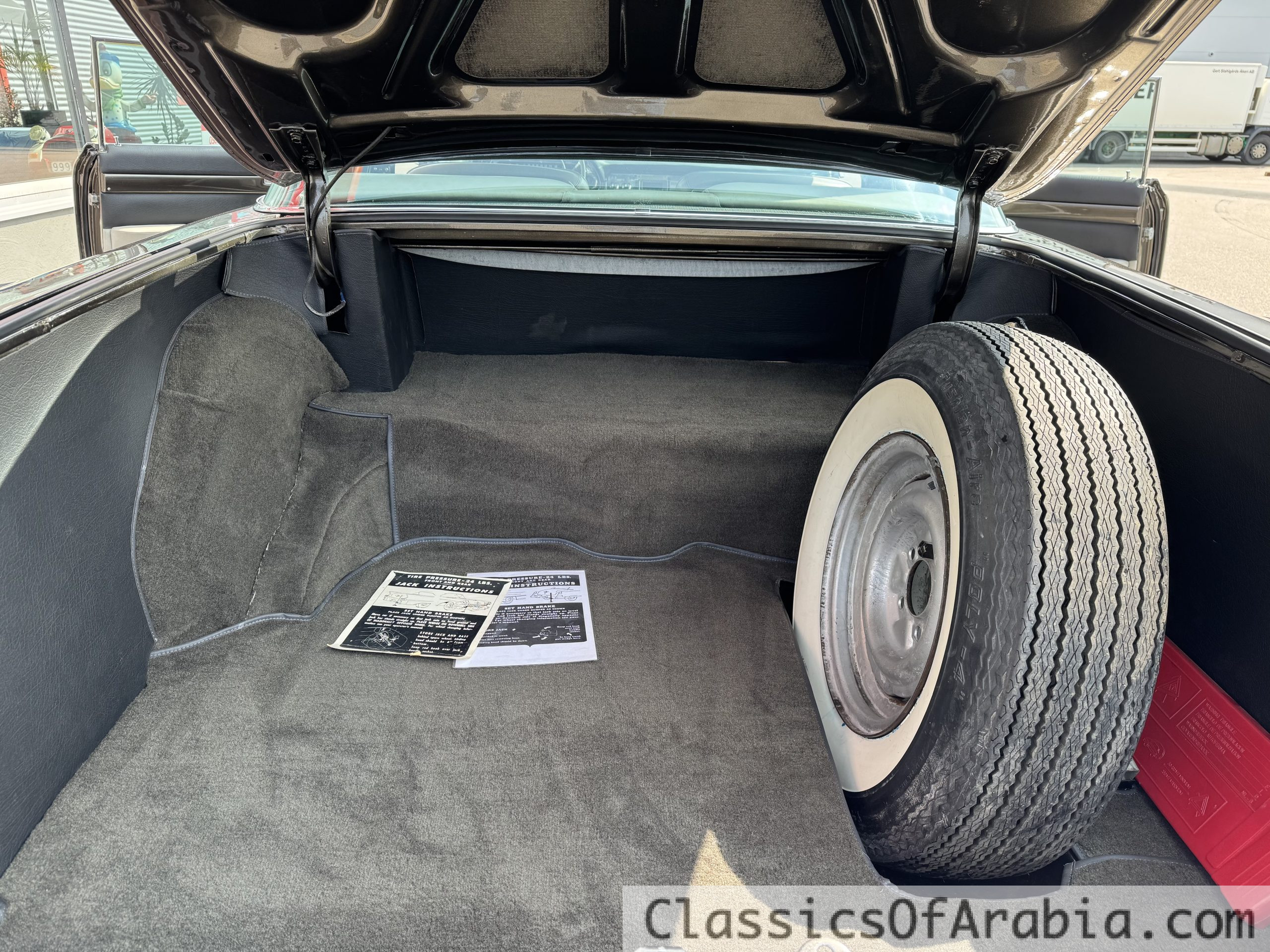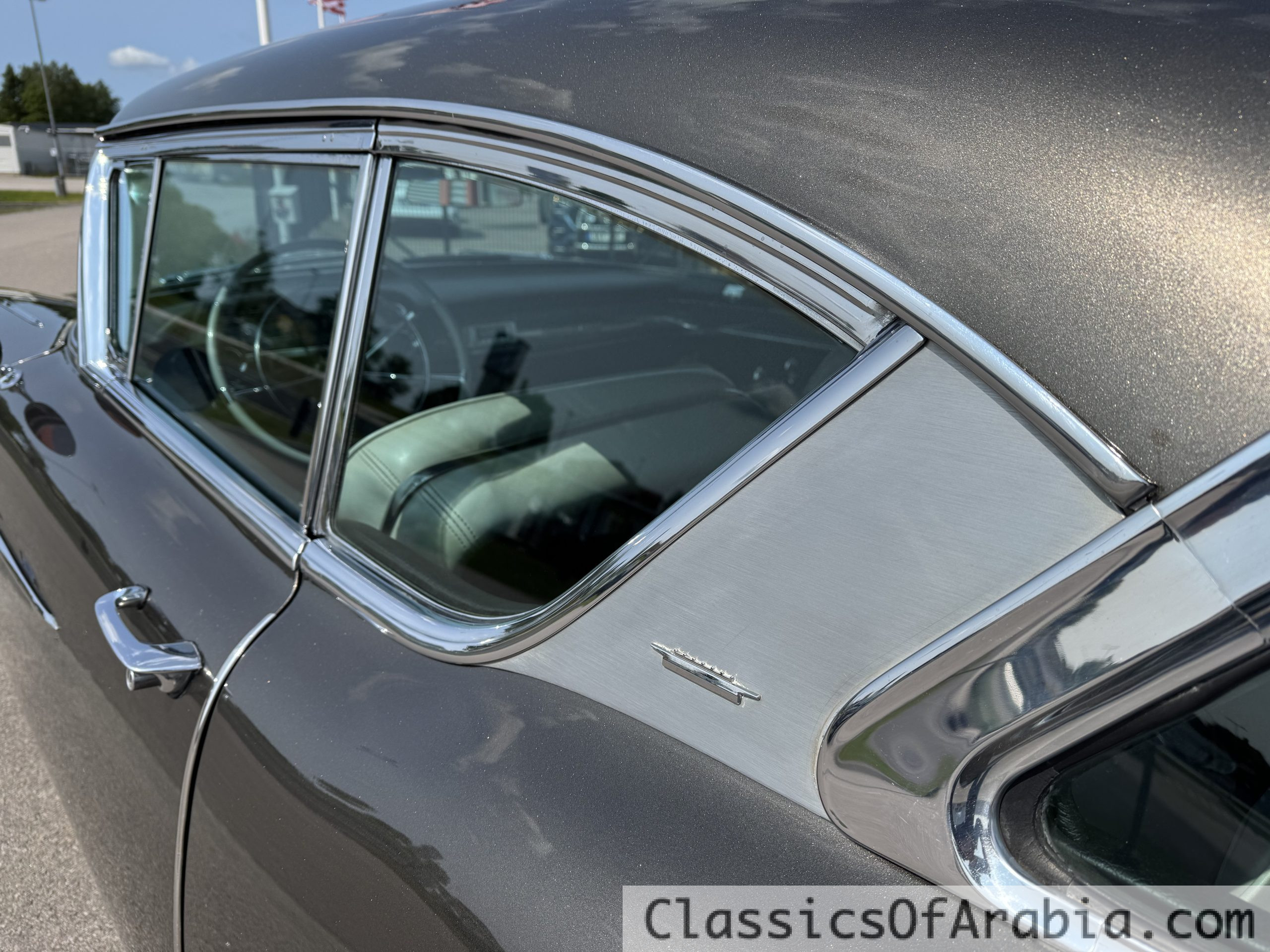 Striking anthracite gray metallic paint. Leather interior. V8 engine. Automatic transmission. Air conditioning. Power windows. 6-way power seat. Power steering. Power brakes. Retro-style stereo. Day and night rearview mirror. Adjustable side mirror. Tinted windows. Whitewall tires. Seat belts front and rear. Door guards. Extremely high-quality and expensive repaint. New leather interior. New trunk upholstery. Almost all chrome has been re-chromed. New gold emblems.