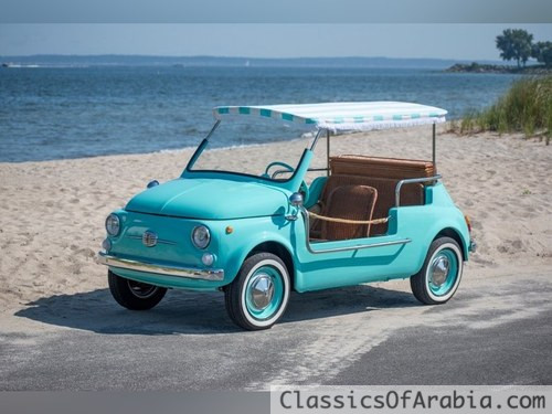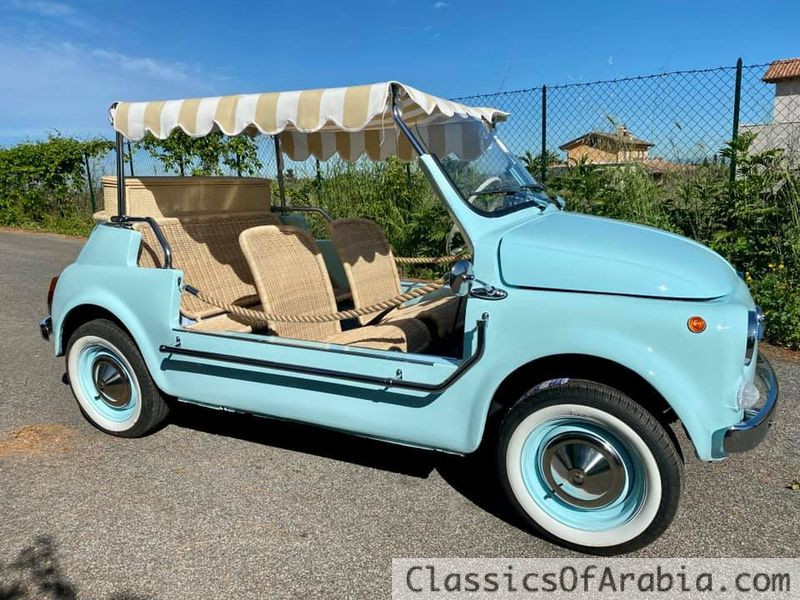 > > Equipment includes a striped surrey top with a white fringe, bright trim, a vented rear deck lid, Fiat 500 Jolly Conversion Steel 12″ wheels are finished in white and wear hubcaps .