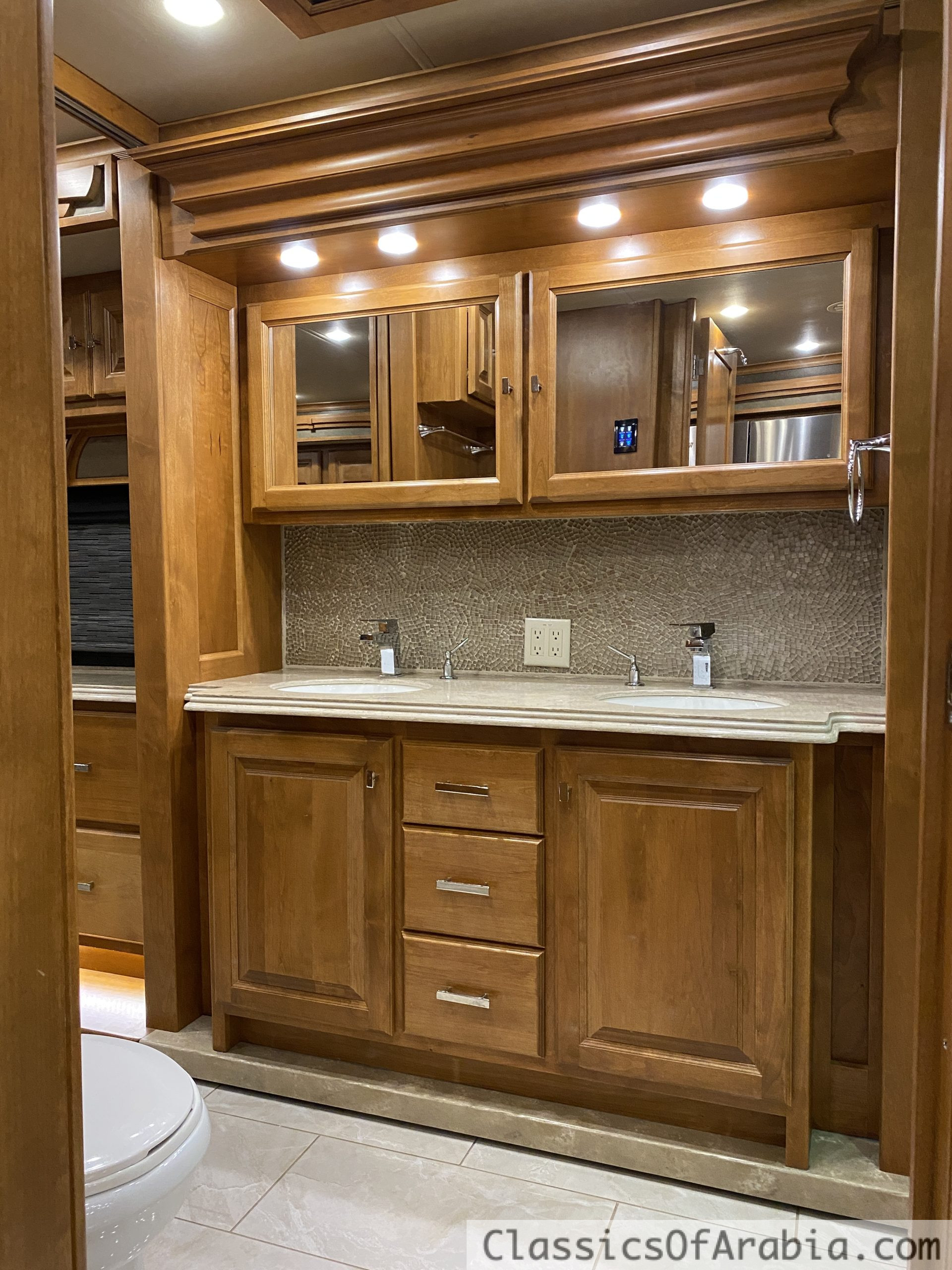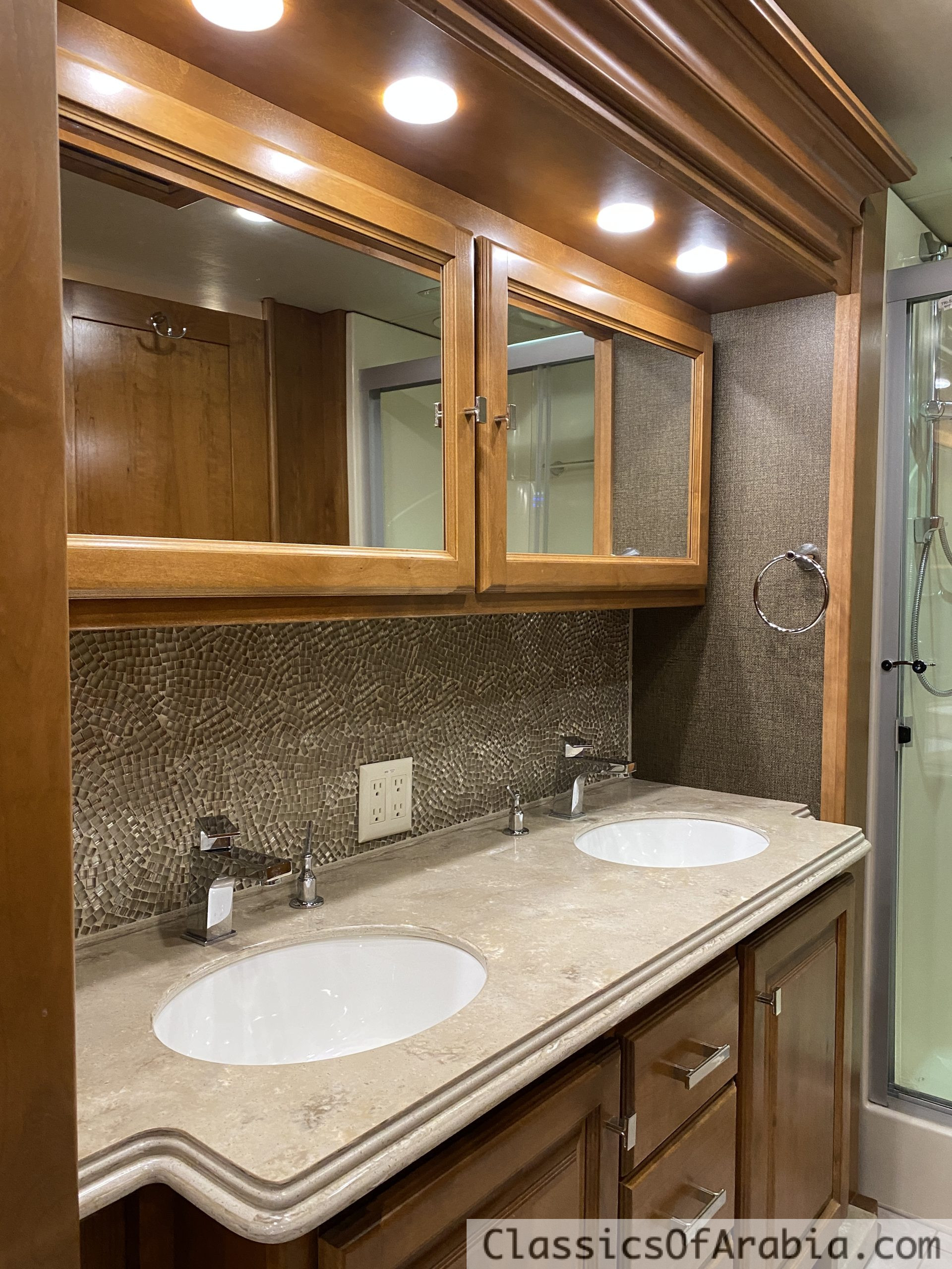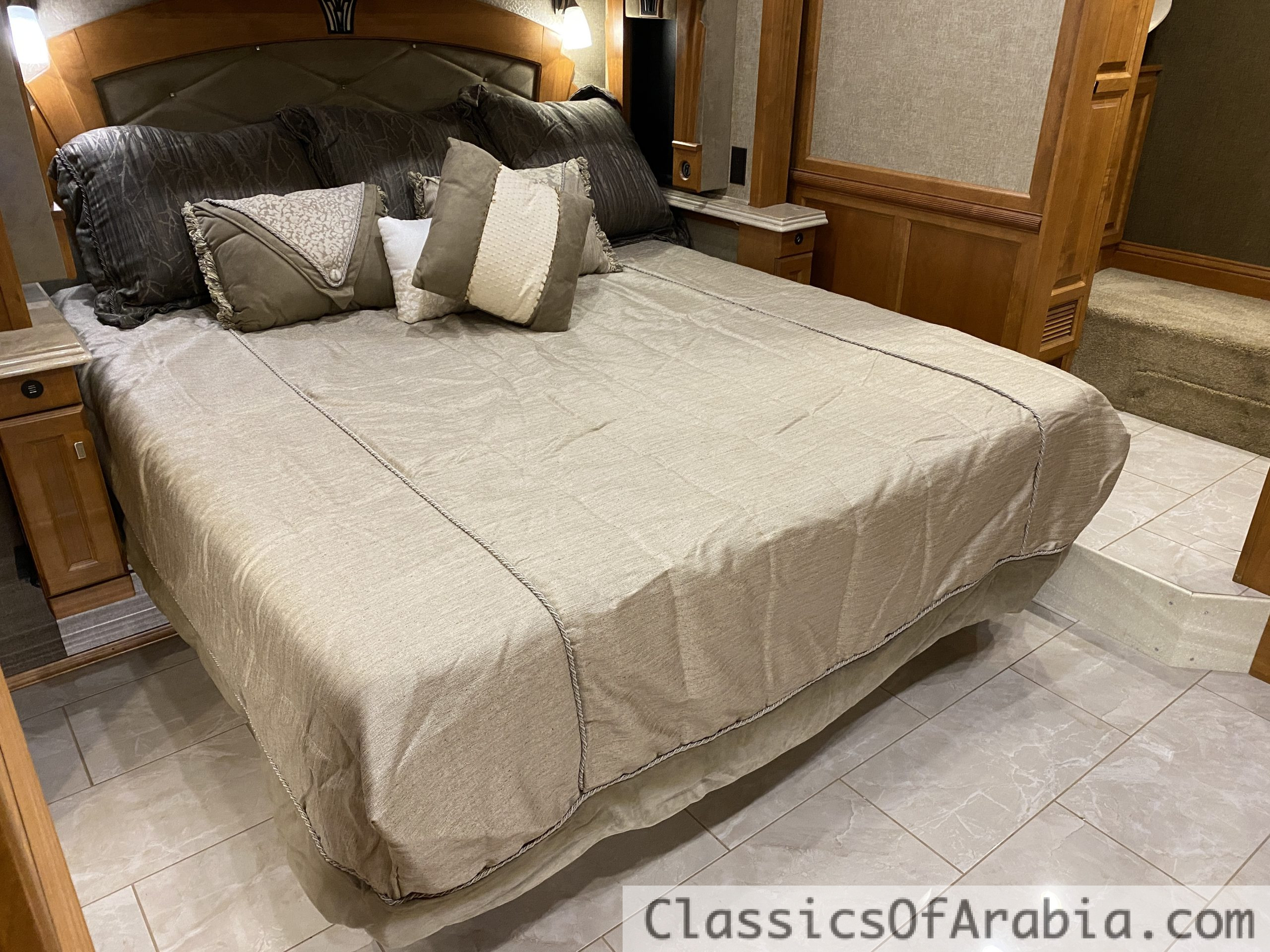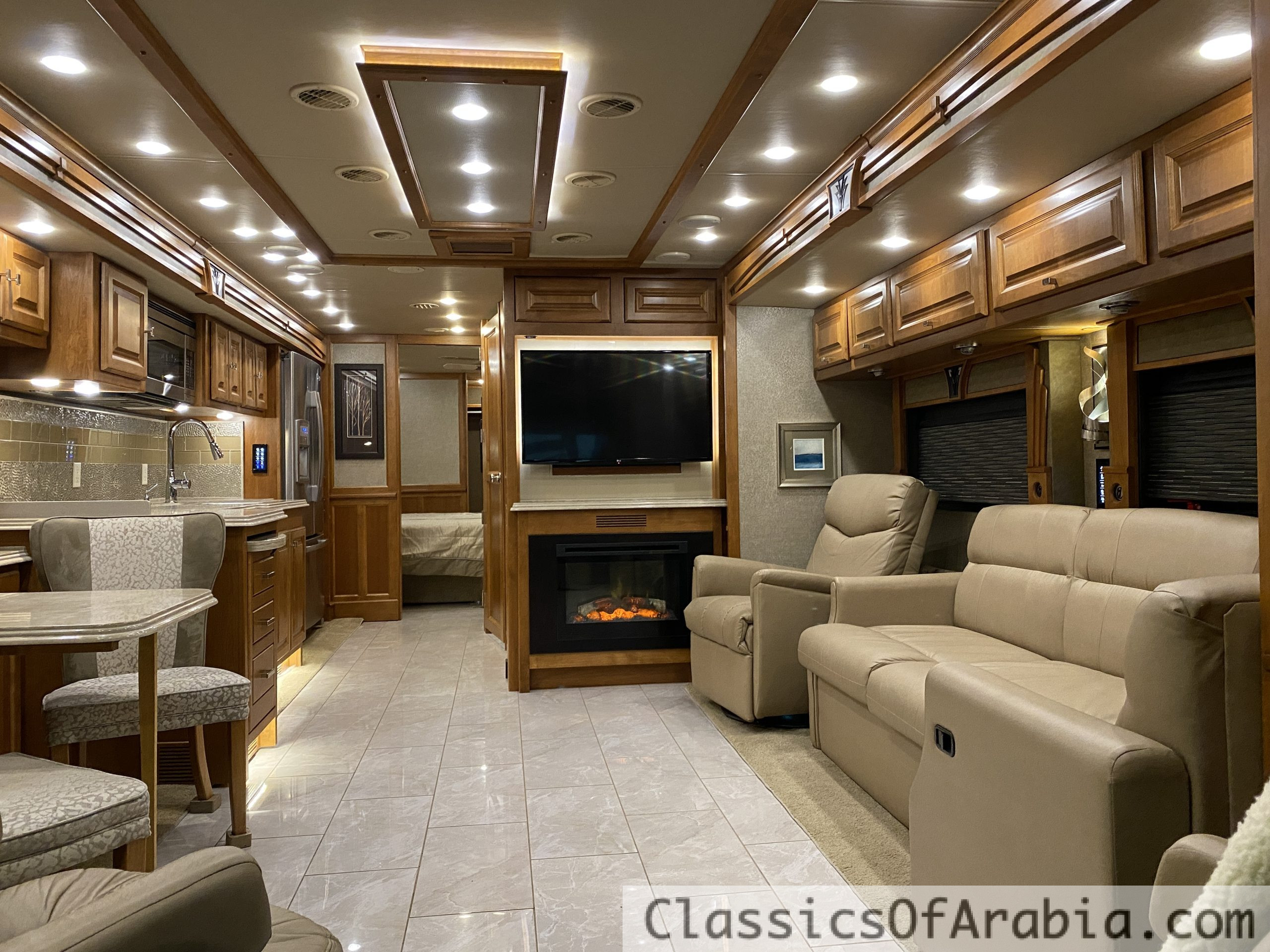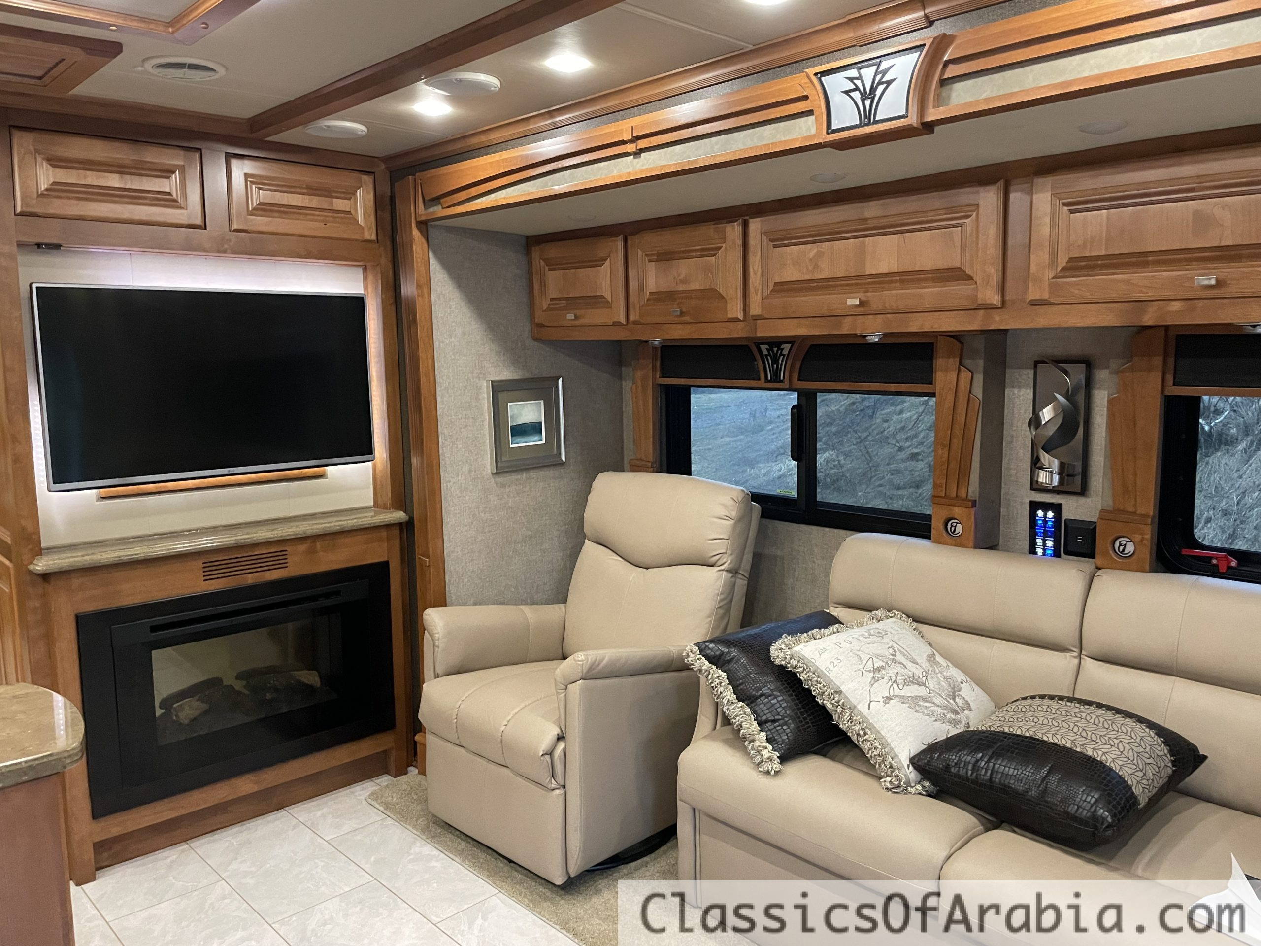 It features a rear-mounted 8.9-liter Cummins ISL diesel engine with 380 hp, paired with an Allison MH 300 6-speed automatic transmission. Full air suspension. Fully automatic leveling system with four hydraulic jacks. Onan 10 kW diesel generator mounted in the front of the vehicle. This is an all-electric coach, meaning there is no gas onboard – everything runs on electricity. 4 large slide-outs. One-piece molded roof. Large fridge & freezer. Induction cooktop. Oven. Microwave. Kitchen fan. Ice maker with chilled water. Dishwasher. Washing machine & dryer. Central vacuum system. Dinette for 4 people. Large, spacious corner sofa that converts into a bed. Large walk-in closet. Spacious bathroom with double sinks, large shower & dual-entry doors. Fully electric front seats that swivel. Tiled floors and wall tiles in light, elegant colors. Three large TVs inside. One large outdoor TV with soundbar. DVD player. Awning. Roof fan in the bedroom. Two roof vents with fans. Gas alarm. Outdoor shower. Stereo system. Electric blackout blinds. Mosquito door & screens. LED lighting throughout. Power-retractable shore power cable. Power-retractable water hose. Navigation system. Dual rear cameras + dual side cameras. Cruise control. Engine brake. Aqua-Hot 450D diesel-powered hydronic heating system. Water-based heating. 3 roof-mounted A/C units with heat pumps. Underfloor heating. Engine preheater. Electric fireplace that provides heat. Electrically adjustable pedals. Electric entrance steps. Tow hitch. Large exterior storage compartments with slide-out tray. Seatbelts for 5 people. Rear ladder.
